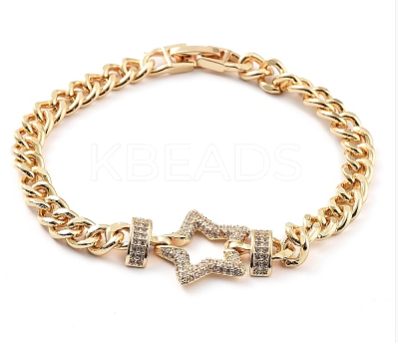 Cubic Zirconia Link Bracelet with Golden Brass Curb Chains, Long-Lasting Plated, Star, 7-7/8 inch(20cm)