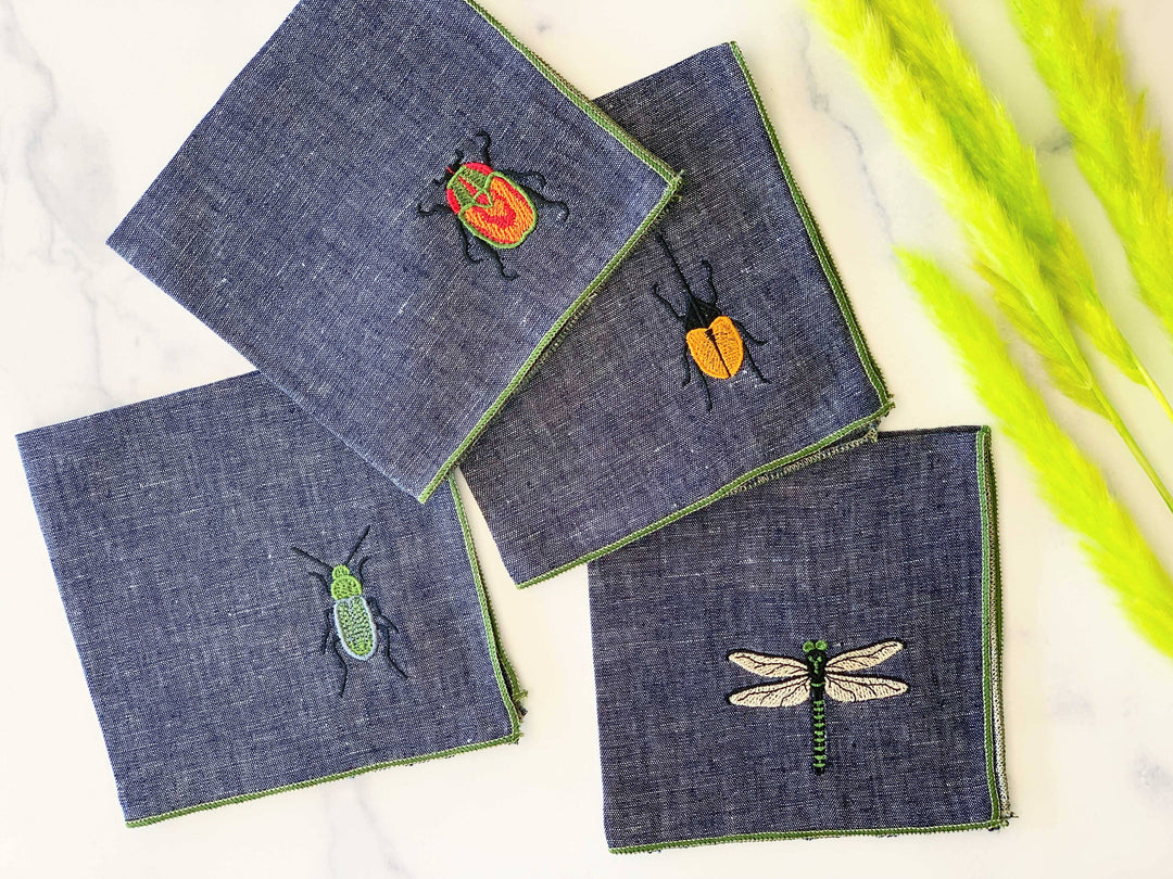 Dot and Army - Insect Embroidery Linen Chambray Cloth Napkins, set of four: 10inch cocktail