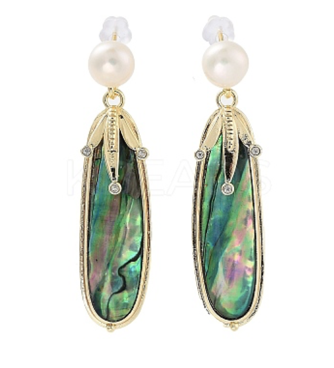 Pearl & Paua Shell Dangle Stud Earrings, with Brass Micro Pave Cubic Zirconia Findings and 925 Sterling Silver Pins, Oval, Real 14K Gold Plated, 45x10.5mm