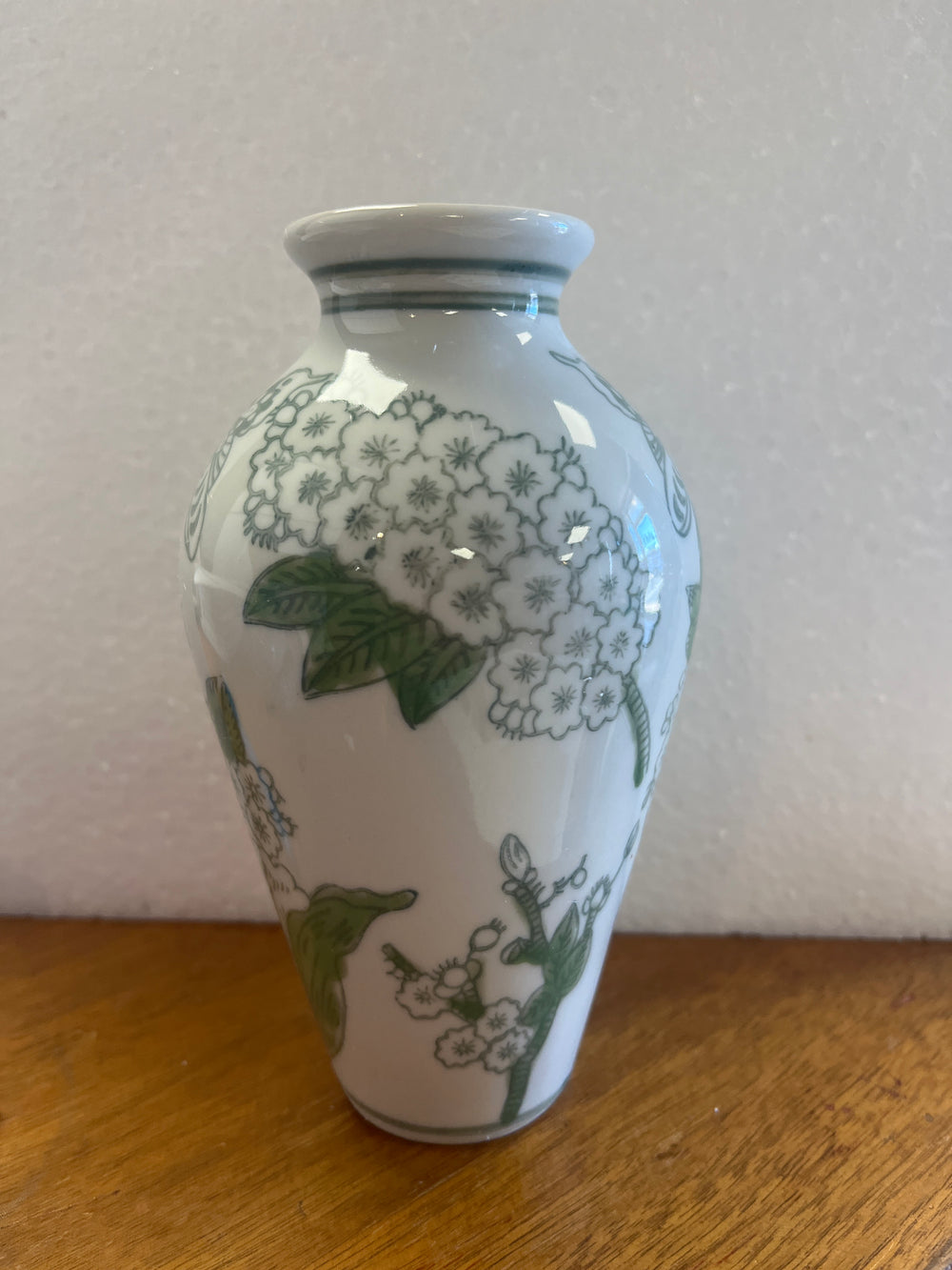 Primrose and Lotus Hand-Painted Mini Green and White Chinoiserie Vases
