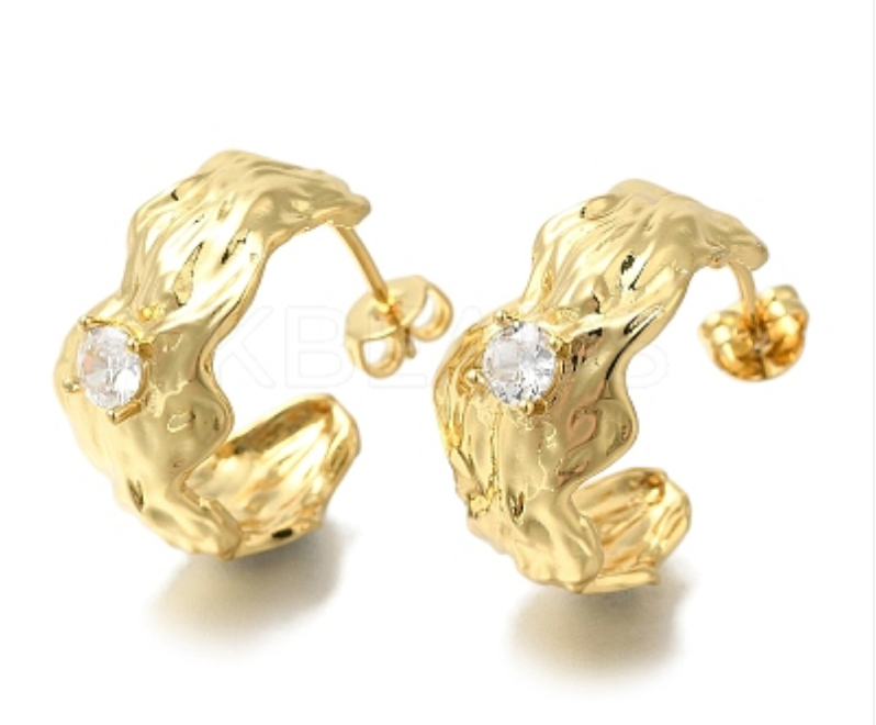 Rack Plating C-Shaped Brass Pave Clear Cubic Zirconia Stud Earrings, Long-Lasting Plated, Lead Free & Cadmium Free, Real 18K Gold Plated