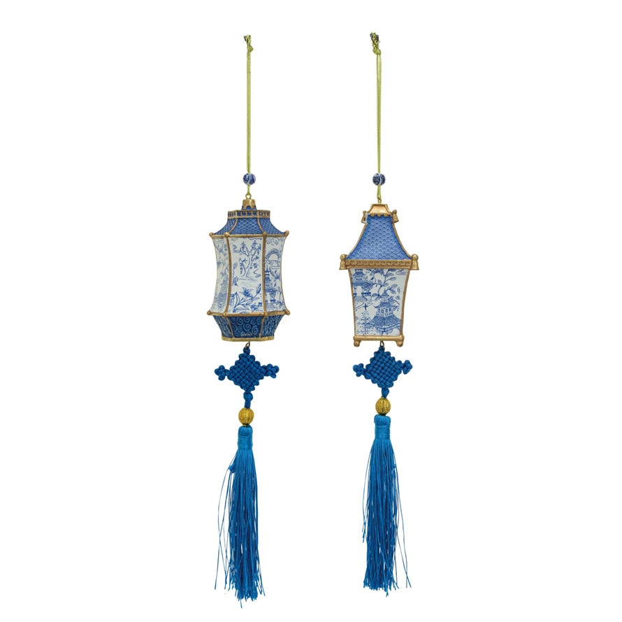 Resin Lantern Ornament w/ Tassel, Blue, White & Gold Finish, 2 Styles