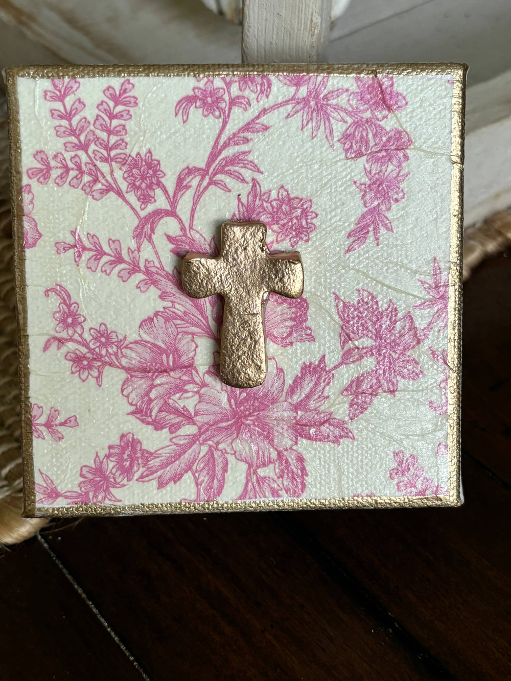 Rouge 225 - Spring Pink Toile Design Cross Canvas Art : Package in Cello Bag with Satin Ribbon