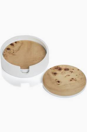 SET/4 ROUND BURL WOOD COASTER IN WHITE TRAY,