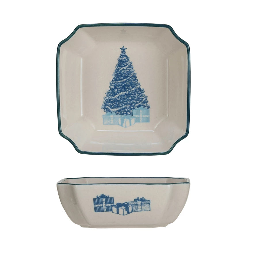 Stoneware Bowl w/ Christmas Tree, Blue & Cream Color