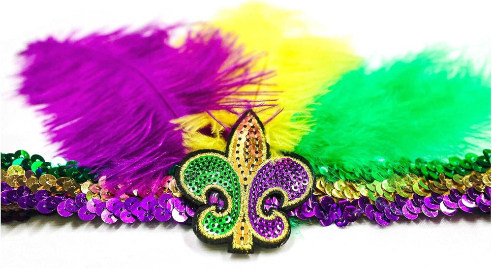 The Mardi Gras Krewe - Mardi Gras Sequin Headband with Feathers, Mardi Gras Accessories, Green Purple and Yellow Feather Headband with Fleur-de-lis
