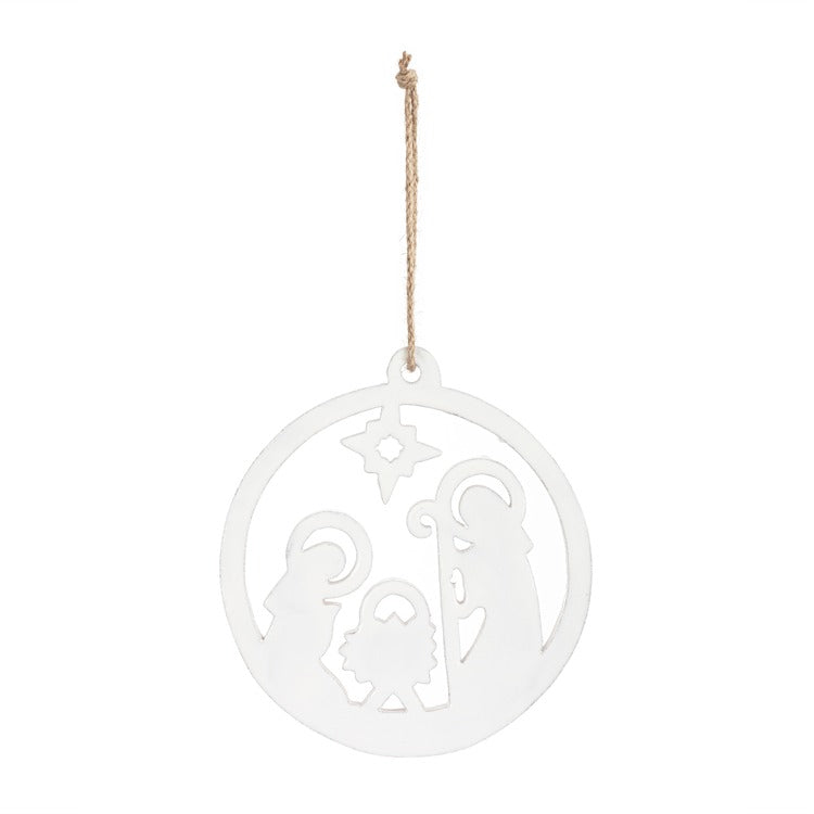 White Enamel Wood Nativity Round Ornament