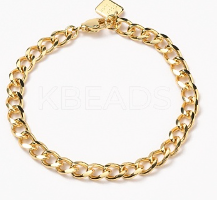 Brass Cuban Link Chain Bracelets, with Lobster Claw Clasps, Long-Lasting Plated, Word Good Luck, Real 18K Gold Plated, 7-1/2 inch