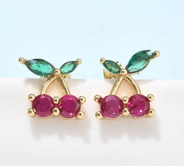 Brass Cubic Zirconia Stud Earrings, Cherry, Real 18K Gold Plated