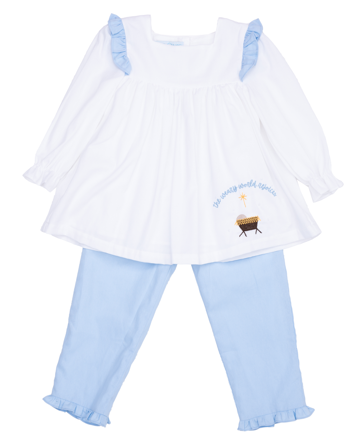 Celebrate the season in the sweetest style with the Patsy Nativity Blue LS Pant Set. Crafted from soft light cord fabric, this playful outfit features charming the weary world was sleeping embroidery that adds a classic Holiday touch. Perfect for Christmas Sunday at church and all of the season's festivities.