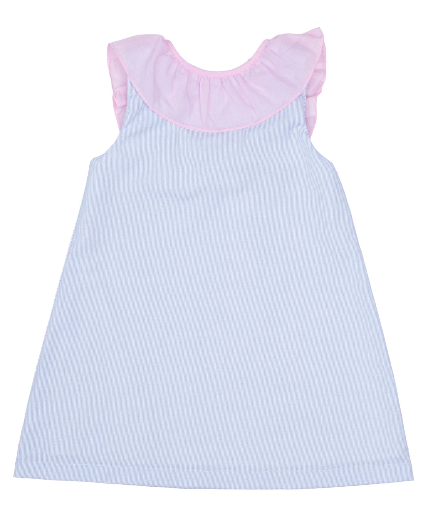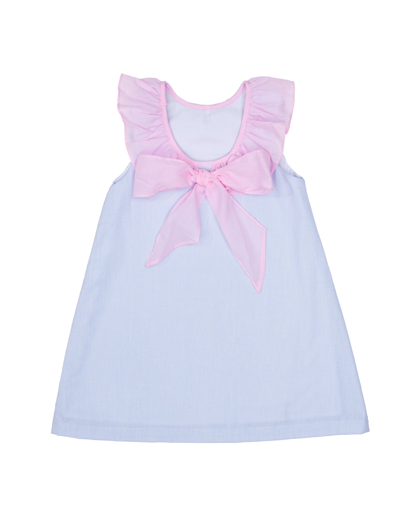 The crisp pale blue dress with light pink ruffles meets effortless spring style all tied up with a bow. Perfect for anyone who believes the best-dressed moments happen when comfort and style align! This coordinates perfectly with all the pieces in our Summer Blues Collection.