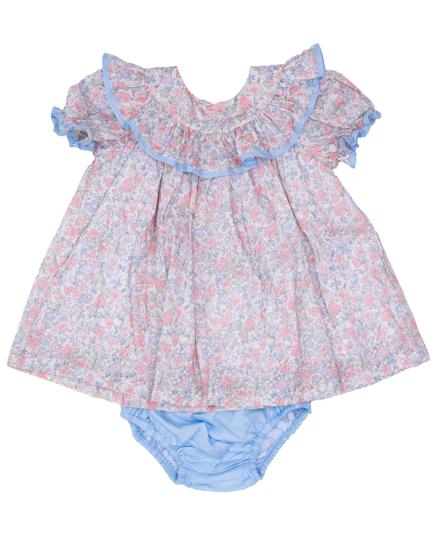 Soft pastel blooms meet playful style in this delightful set, where gentle florals are beautifully framed by pale blue trim and a charming ruffled collar. Every detail whispers sweetness—from the dreamy color palette to the whimsical neckline that adds just the right amount of personality. A joyful choice for little fashionistas who adore a touch of floral magic.