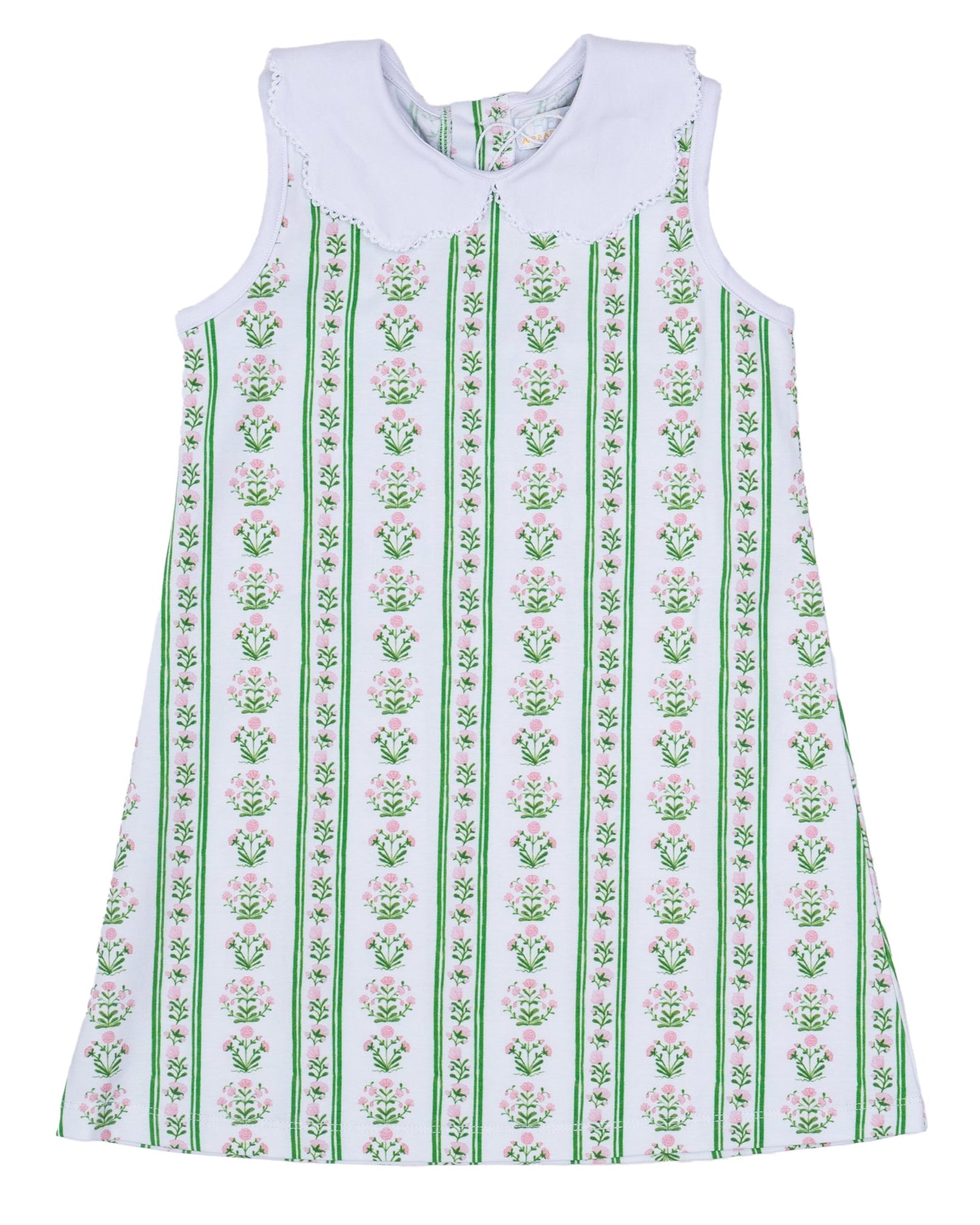 This sweet dress is made of the softest pima cotton, featuring a charming green and pink floral print that captures effortless elegance. The signature scallop moonstitch collar adds a refined, whimsical touch perfect for little ones who love timeless style.