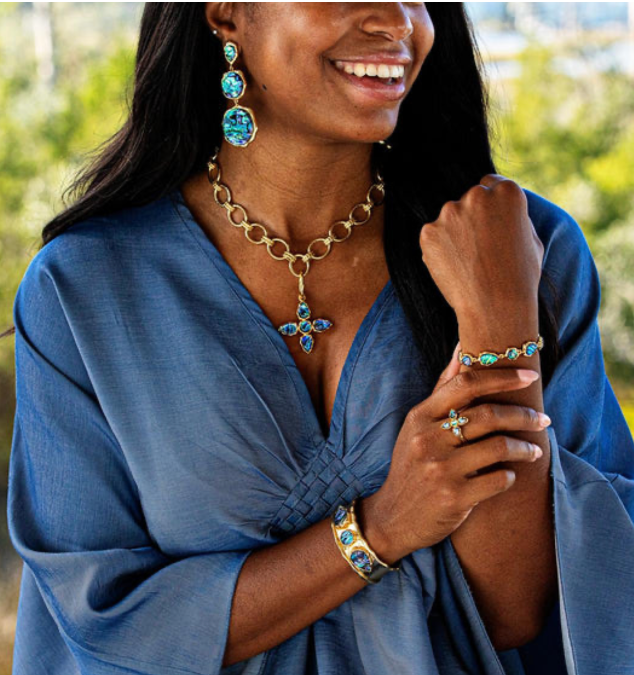 The mysterious treasures of Mother Earth - from the depths of the sea to the dancing northern lights in the sky -inspired this striking collection that features sustainably harvested abalone set in a molten flourish of gleaming gold. Swimming in peacock-plume hues awash in a radiant luster, each piece is completely unique with its own natural variation of color and pattern. Wear this statement cuff alone or in a bracelet stack to add a flash of vibrant jewel-toned greens and blues to your everyday blouse and jeans combination or to lend extra sparkle for special occasions and cocktail hour.