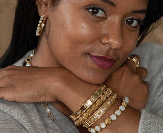 Trios of delectable, polished cabochon gem-drops are united by a sprinkling of golden berries to create this regal bangle that can elevate a pair of jeans or bring the perfect splash of glamor to your lucky business suit, in a snap. Either way, it’s perfect for queening over your to-do list with exquisite style and grace. Stunning on its own, even better in a stack!