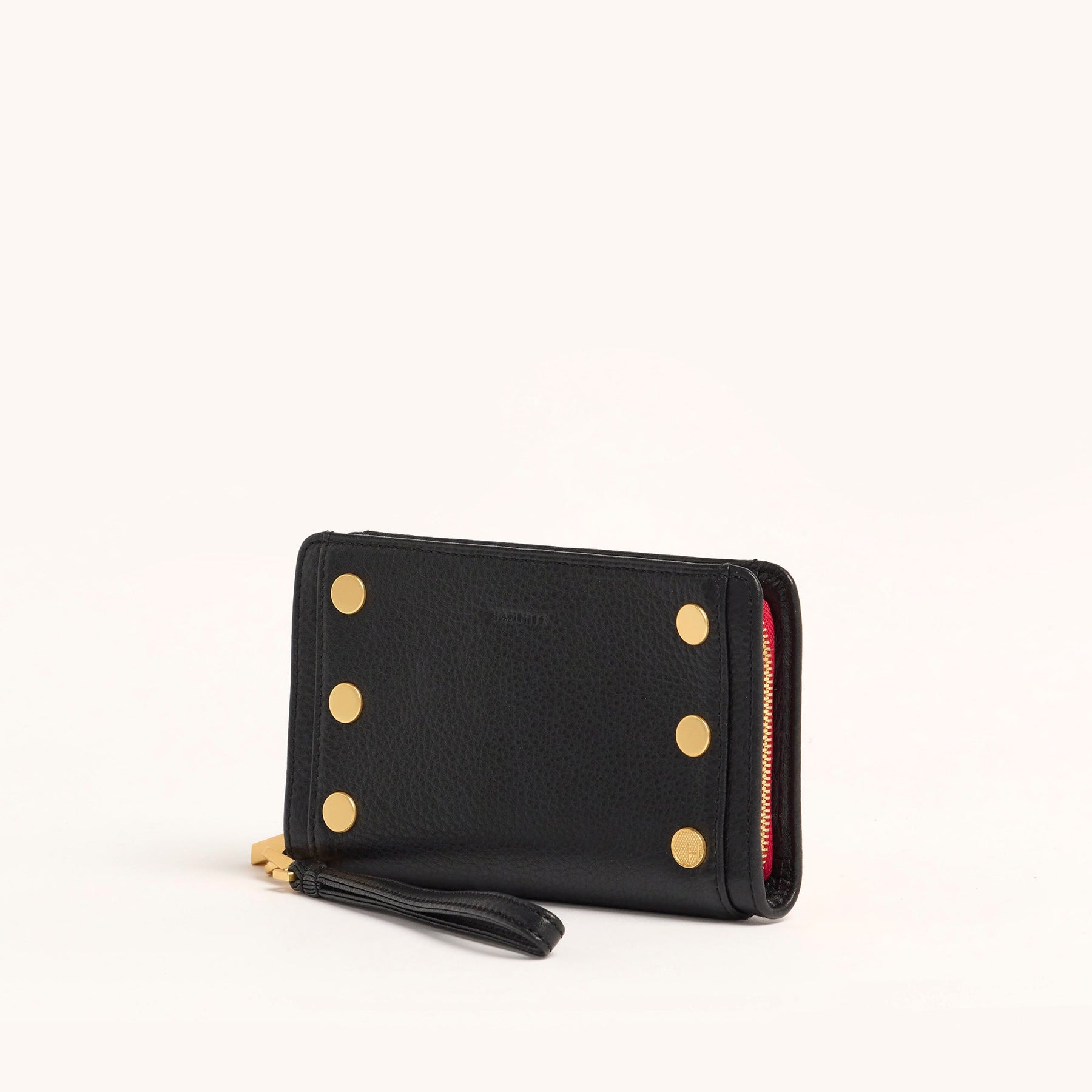 Meet the Bryant Wallet: This sleek continental design combines style and functionality with effortless ease. Featuring Bryant-inspired details like signature front-facing rivets and a turned-in front panel, this wallet is both timeless and versatile. Featuring an organized layout with 10 card slots, an ID window, a zippered pocket, and a detachable wristlet, the Bryant Wallet is soon to be your ultimate everyday essential. Crafted with our classic black pebbled leather, red zipper tape and brushed gold hardware.