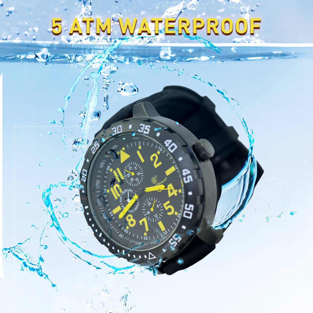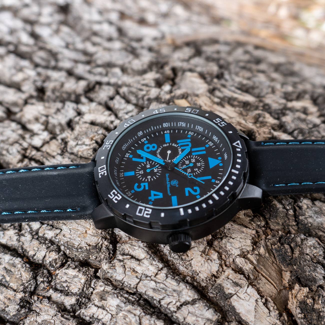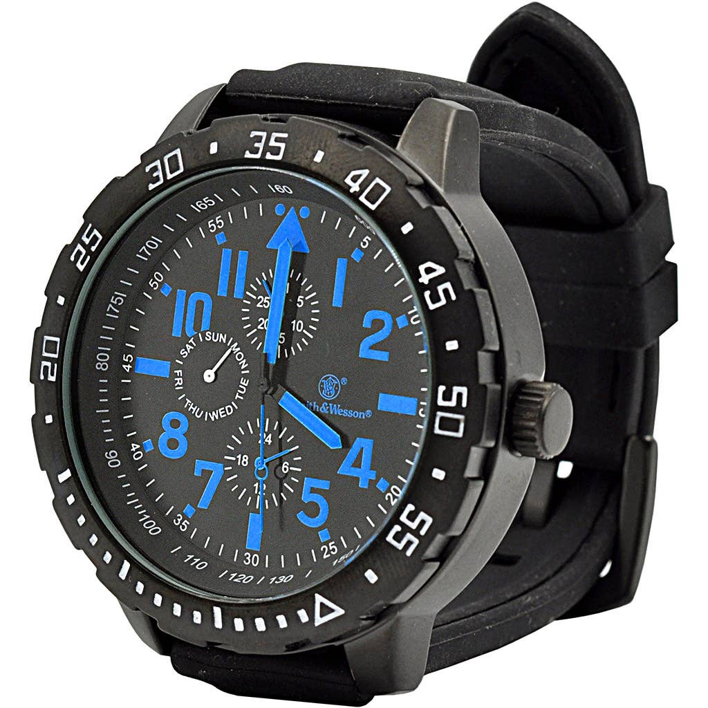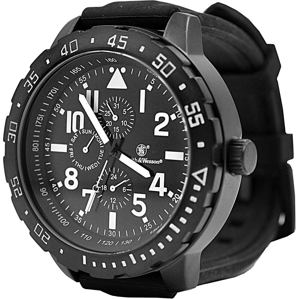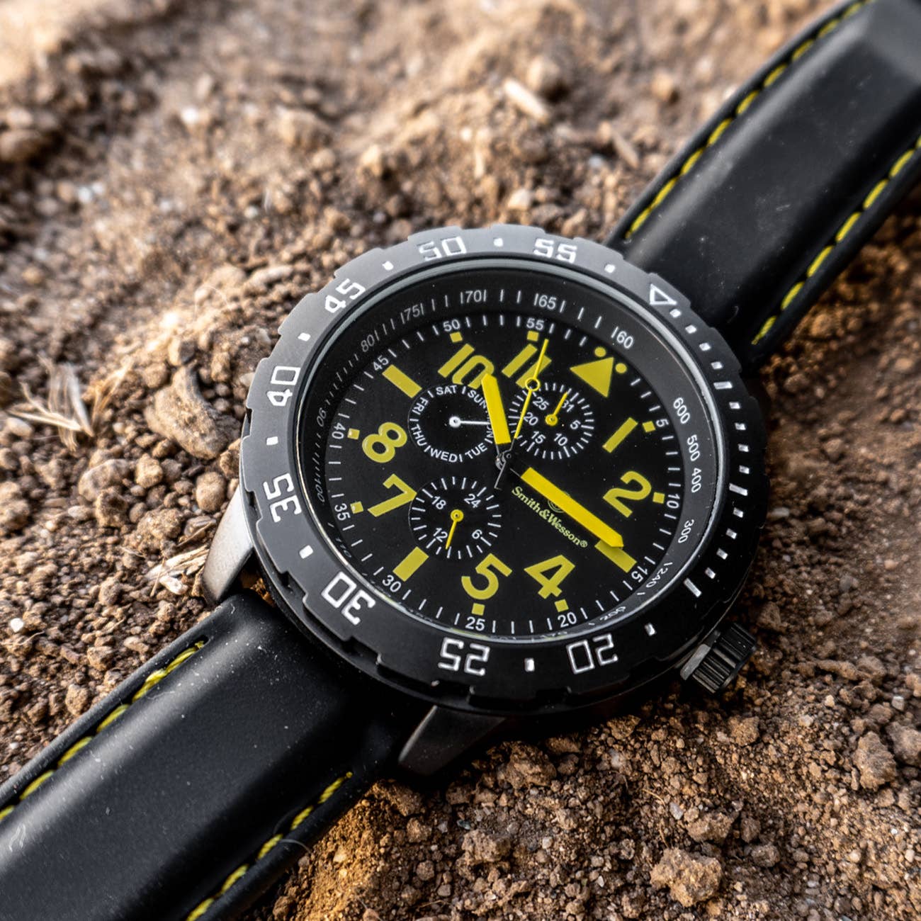 The Smith & Wesson Calibrator watch is a stylish and functional timepiece that blends the brand's iconic design with modern features. It is a popular choice for those who appreciate a rugged and reliable watch with a touch of sophistication. • Water resistant to 50 Meters • Japanese Movement • Stainless Steel Caseback • Rubber Strap with Colored Stitching • 1-year limited warranty • Item Weight (Oz): 3.6 • Face Diameter and Thickness (mm): 51 x 15