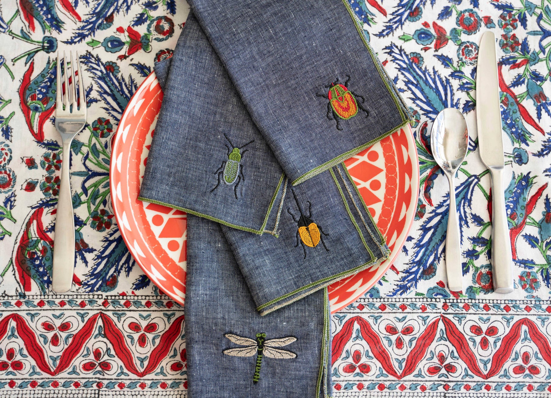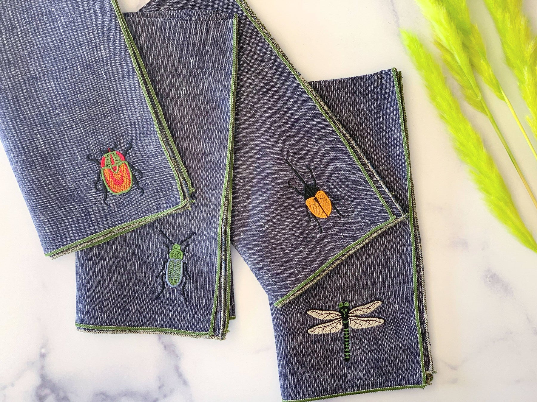 Dot and Army - Insect Embroidery Linen Chambray Cloth Napkins, set of four: 10inch cocktail