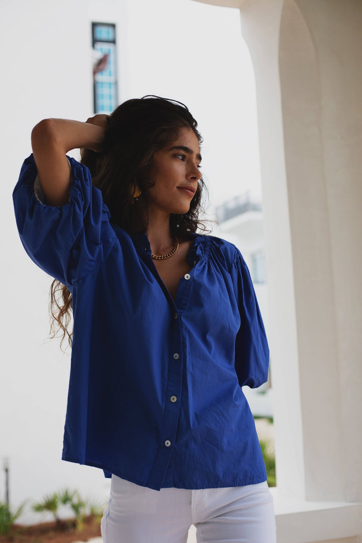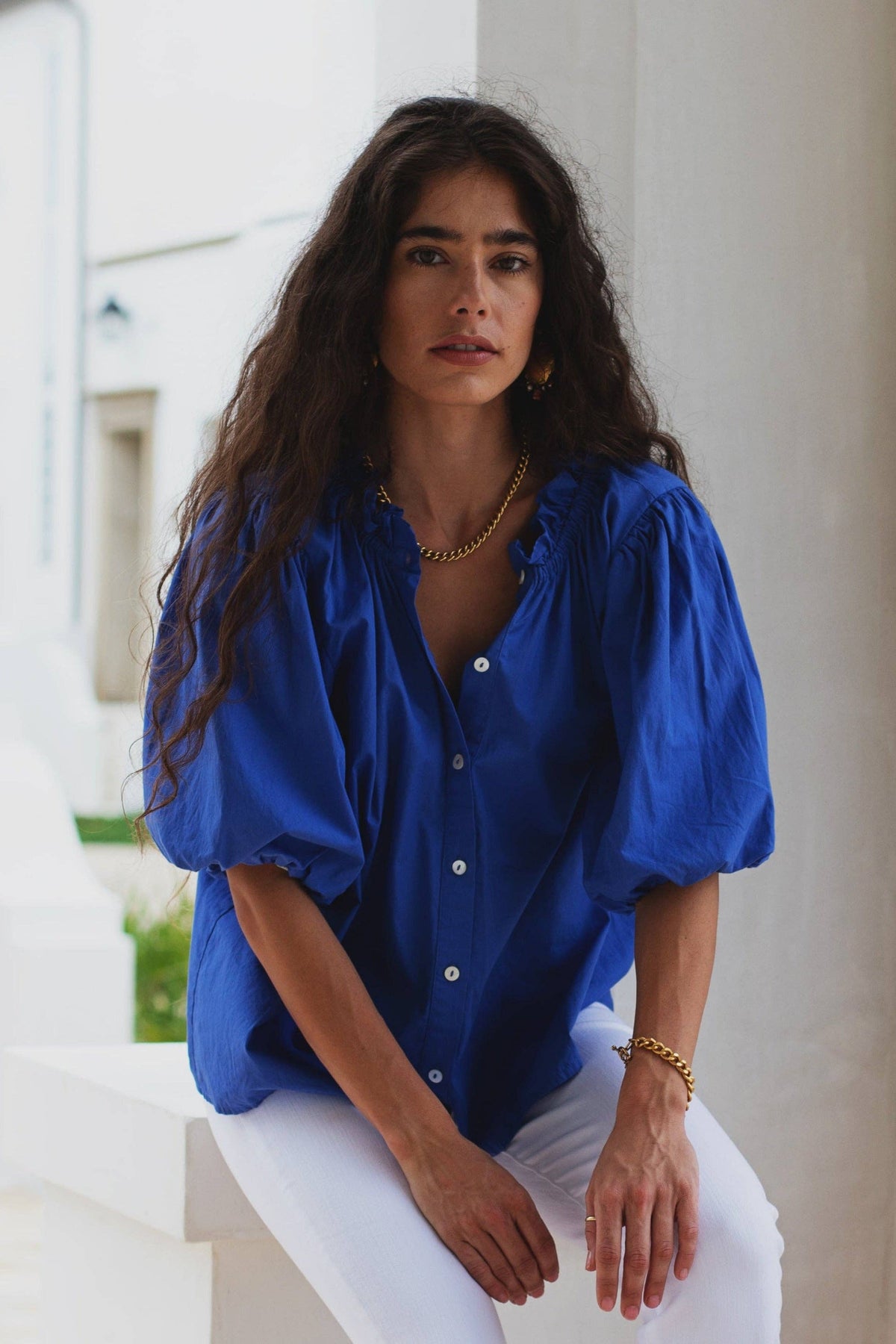 STYLE TIP: Get ready to add some flair to your wardrobe with the Daisy Blouse! The puff sleeves give a flattering fit and timeless charm to this versatile top. Designed for effortless elegance, the cotton fabric offers both structure and breathability. So whether you're dressing up or keeping it casual, this blouse has got you covered with signature style and comfort. Complete the look: Hayley Short in Royal Blue + Daisy Clutch