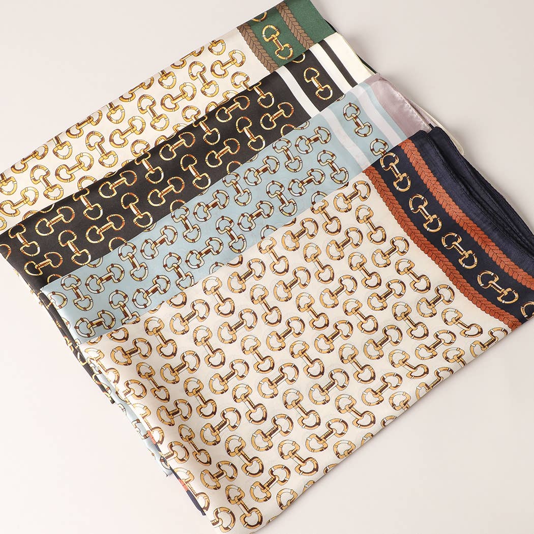Satin Horsebit Print Light Weight Soft Scarf - Satin Horsebit Pattern Print - Square Shaped Scarf - Light Weight Soft Scarf - 100% Polyester ** Size: Approx. 26.5" x 26.5" ** Wrap yourself in elegant comfort with our lightweight soft scarf. Crafted from the finest materials, this scarf drapes gracefully around your neck, providing a subtle warmth without weighing you down. Its airy texture delicately caresses your skin, making it perfect for any season or occasion. Whether you're dressing up a casual outfit or adding a touch of sophistication to your evening attire, this versatile accessory effortlessly elevates your style. With a gentle drape and luxurious feel, our lightweight soft scarf is an essential addition to your wardrobe, offering both style and comfort in equal measure.