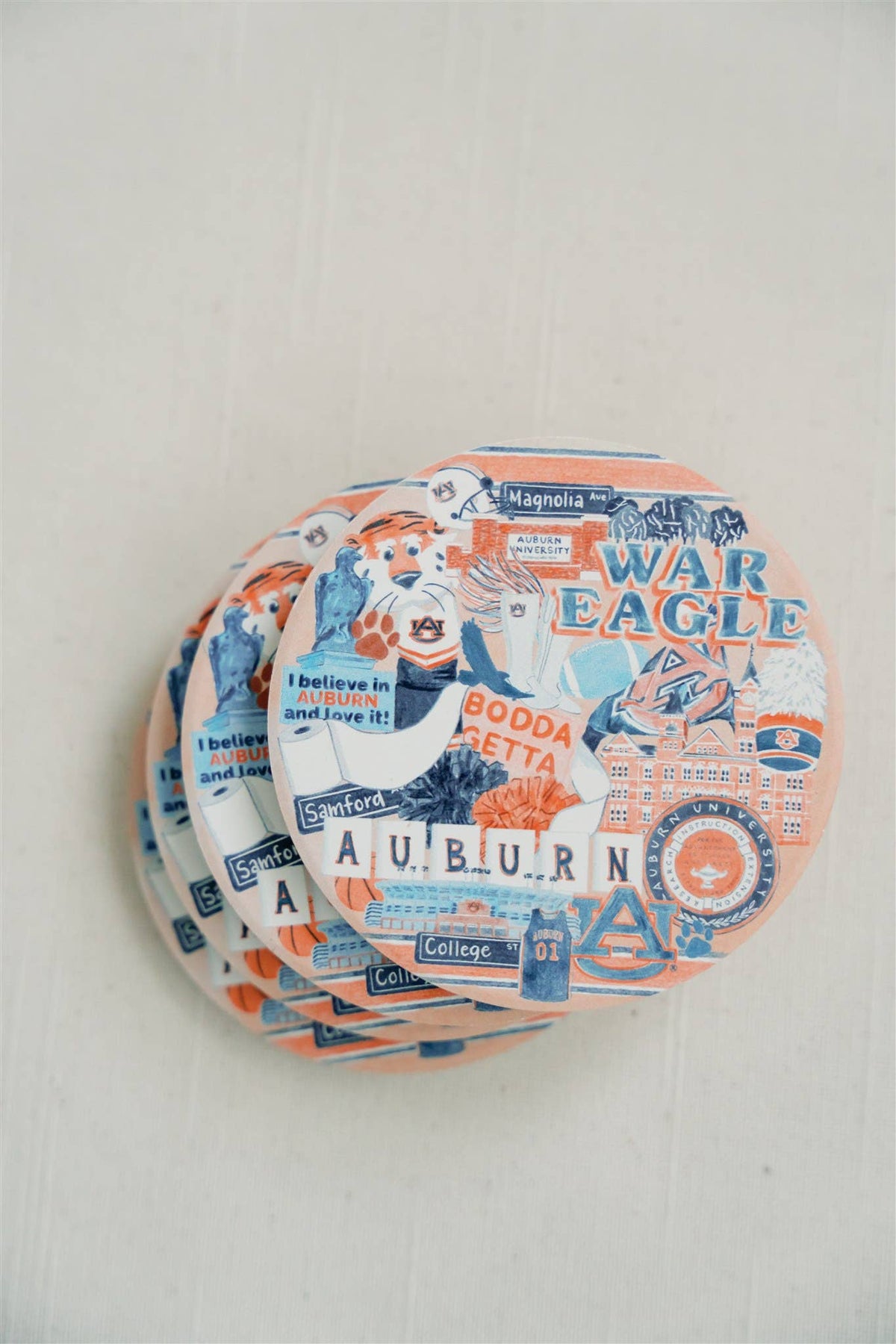 OFFICIALLY LICENSED BY AUBURN UNIVERSITY thick ceramic coasters with cork bottom featuring a watercolored Auburn artwork. Coasters are 4 inches in diameter. Packaged with gold tie. Auburn, collegiate, graduation, reusable, ceramic, Aubie, University priced per coaster
