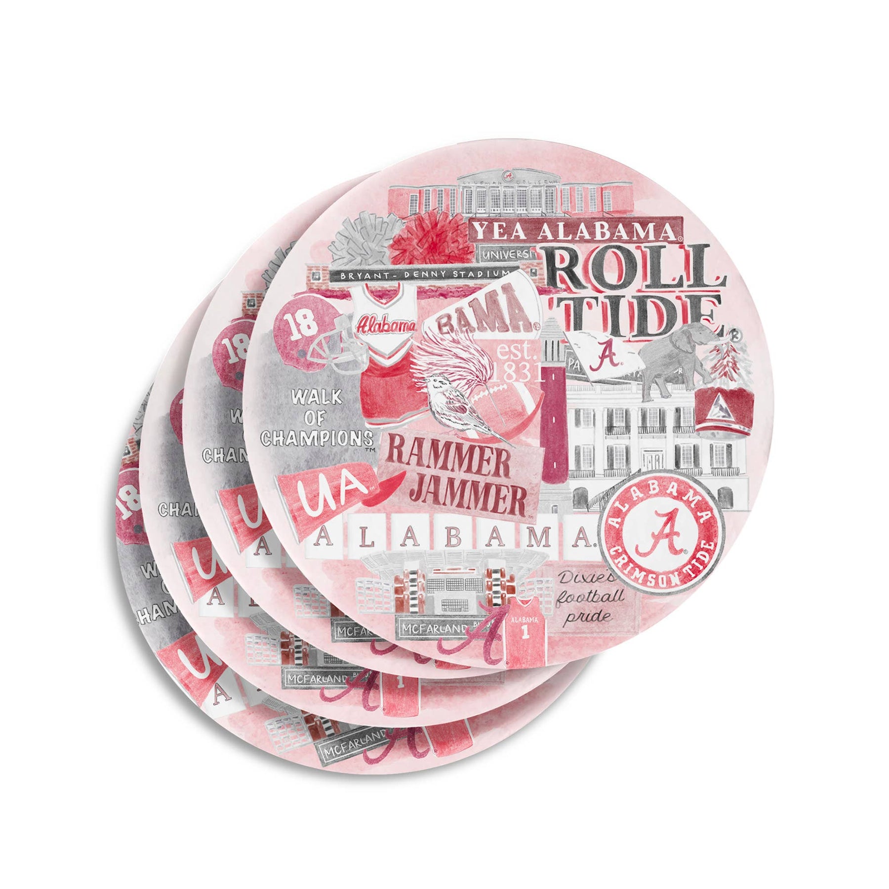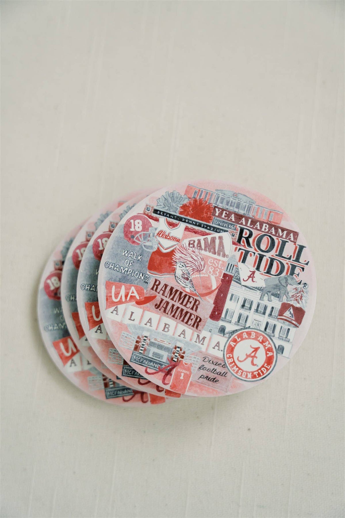 OFFICIALLY LICENSED BY THE UNIVERSITY OF ALABAMA thick ceramic coasters with cork bottom featuring a watercolored Alabama artwork Coasters are 4 inches in diameter. Packaged with gold tie. Alabama, collegiate, graduation, reusable, ceramic, Bama, University priced as 1 coaster