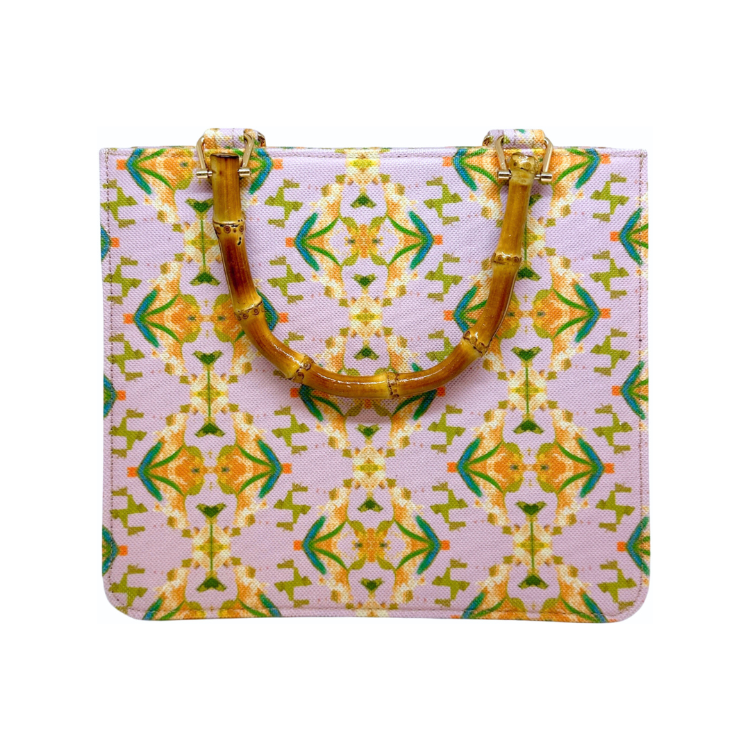 Inspired by a loved one's trip to Turkey after she brought home a dashing Turkish rug. Just like the artisanal Turkish craft, the "Elle" bags hand-crafted in Turkey, showcase the bespoke craftsmanship on your arm. The curved, organic bamboo handles pair with the polyester fabric decked with vibrant designs. Fitted with an inner yellow zip pocket to hold your lip gloss and enough space to pack in the daily necessities. The "Elle" bags can accompany a casual or dressed-up look wherever you go. * Product Details * Care Instructions : Spot clean/dry clean recommended. * Organic bamboo handle * Gold yellow zip pocket inside * Fabric Material: 100% Polyester * Handmade in Turkey * Drawstring bag for case * Bag dimensions: 9" x 10" * Bamboo handle length: