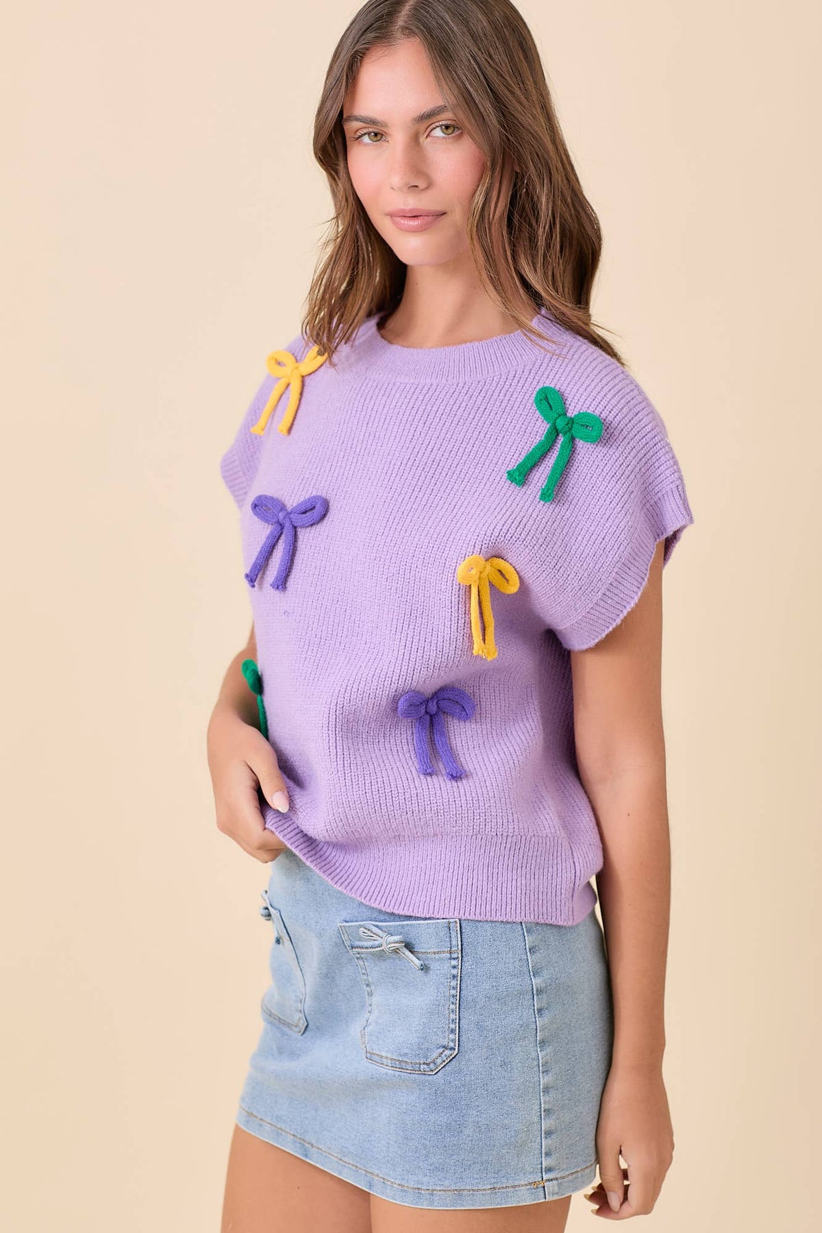 Main Strip - Mardi Gras Ribbon Bow Knit Top: PURPLE / L