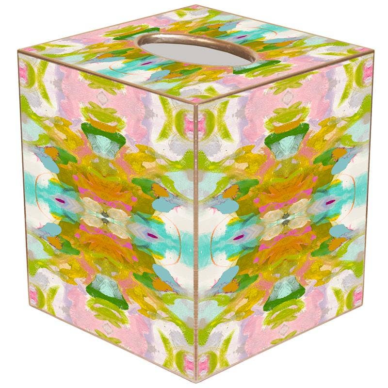 Our decoupage tissue box covers are handmade to order by our wonderful team in Houston, TX. They easily slide over any cubed tissue box cover. The artwork is hand-cut, decoupaged, and polished. Each tissue box cover is hand painted in gold or silver around the edges as the finishing touch. We offer 3 materials for the tissue box covers: 1. Papier Mache: $19 Dimensions: 5.5” H x 5” W x 5” L 2. Wood: $30 Dimensions: 5.25” H X 5” W X 5” L 3. Tin: $30 Dimensions: 5.75” H x 5.125” W x 5.125” L