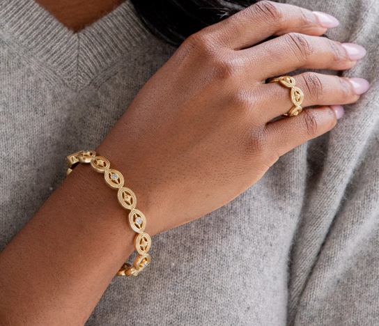 Trust your instincts and follow your inner light with this supremely elegant bangle that features our spin on an elevated compass motif studded with clear cubic zirconia that sparkles like the north star. Divinely interesting on its own or in a bracelet stack, and perfect for embellishing everything from cashmere sweaters to cocktail dresses.