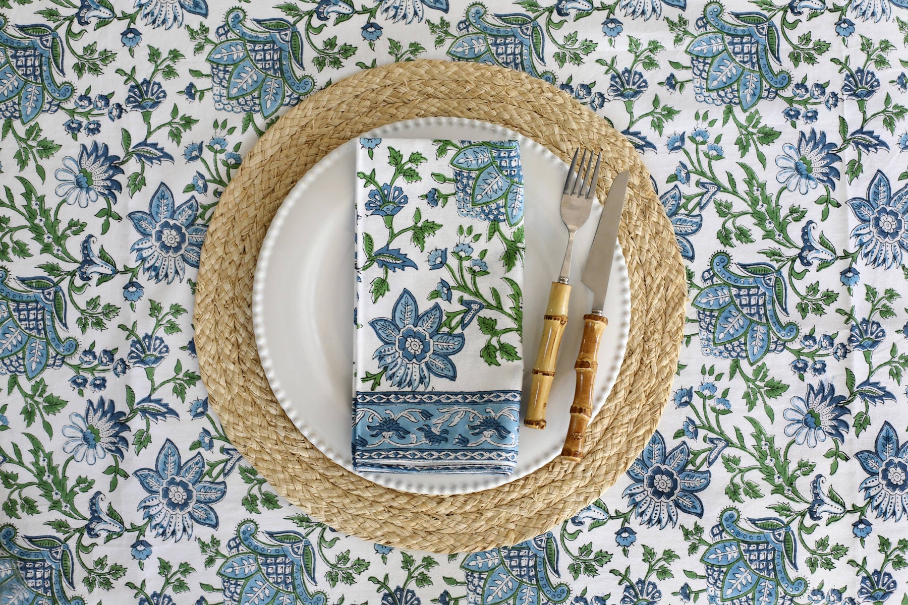 Inspired by the Maharani of Jaipur, Gayatri Devi, our Gayatri pattern is a classic Indian floral design block-printed in a color palette of blues and greens. Create a unique table setting with our hand block-printed tablecloths in fresh, updated riffs on classic Indian designs. Hand block-printed by traditional artisans with hand-carved teak blocks at our fair-trade workshop in Jaipur, India.