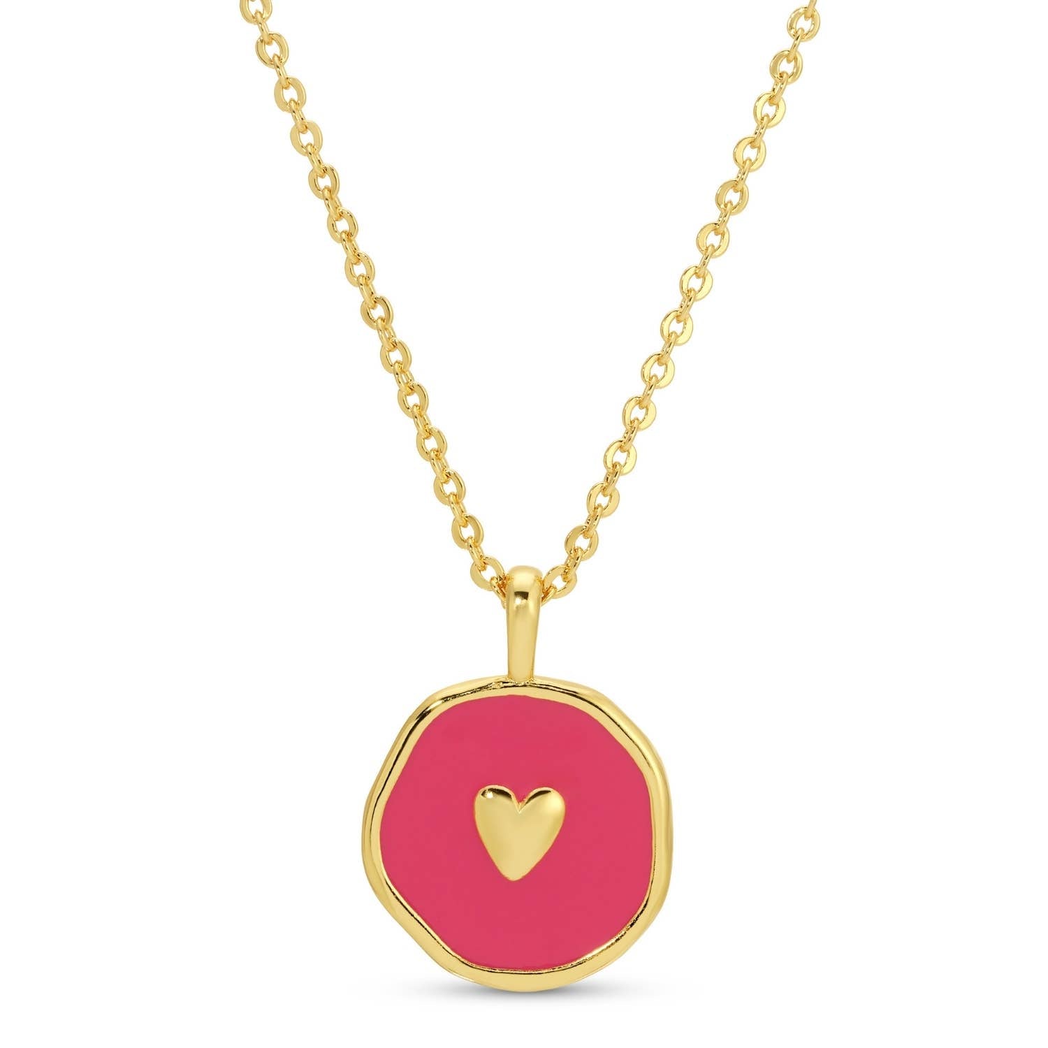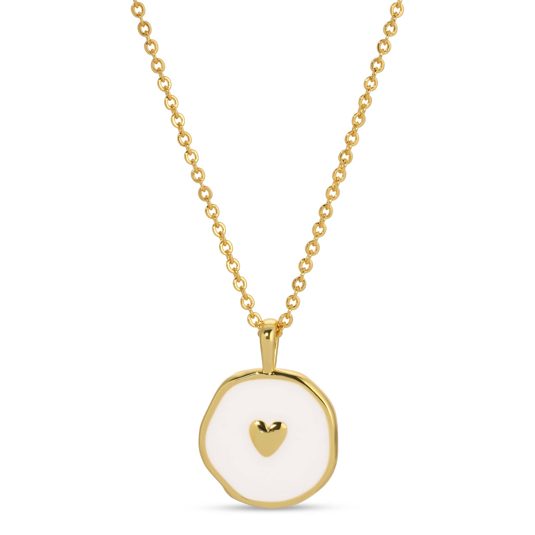 Stunningly crafted, this tiny heart pendant features an enamel background on a brass, plated 18" necklace. .5" Pendant, .75" Drop 18" Necklace 18k Gold Plated Brass Base Enamel Packaging: 'Quick-Display' Necklace Card
