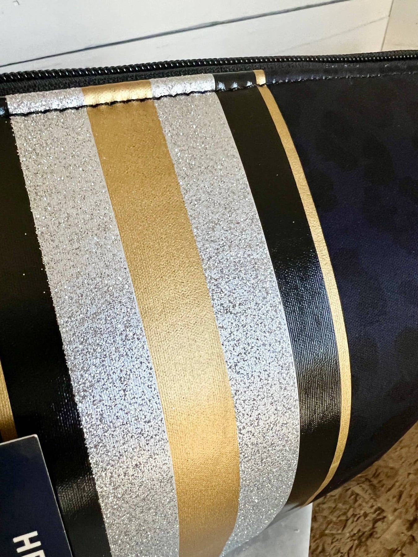 Mixed metallics for the win! My friend Liz always looks put together, is fashion forward and wore Golden Goose before Golden Goose were cool. We were day drinking and she suggested a black tote with a combination of silver and gold. I told her she was crazy, but indeed she was right on! The Lizzy was the top seller at both Dallas and Atlanta markets. The black tone on tone leopard with mixed metallics is a sophisticated and fun tote you can dress up or down. Liz is always up for poolside Corona Seltzers and a good gab session. She has supported me from the beginning, and I appreciate her and her friendship. The internal neoprene has a smooth and streamline look that is complimented by the rubber Taylor Gray logo on the pocket. Dimensions: Tote...23 inches wide (side panels expanded) x 12 inches tall x 11 inches deep Privacy pouch...8 inches wide x 5.5 inches tall x 1 inch deep