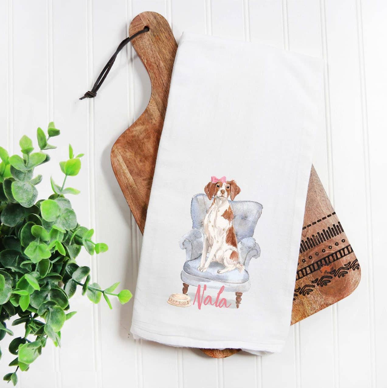The Preppy Pineapple Home - Brittany Spaniel Flour Sack Tea Towel, Personalized Pet Gift: Captain Hat / Palm Chair
